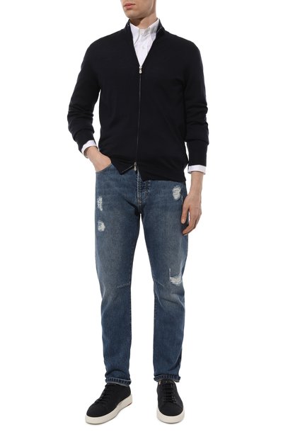 Кардиган с отложным воротником выполнили фактурным узором из шерстяной пряжи с добавлением кашемира. Модель с эластичными поясом и манжетами застегивается брендированными пуговицами.