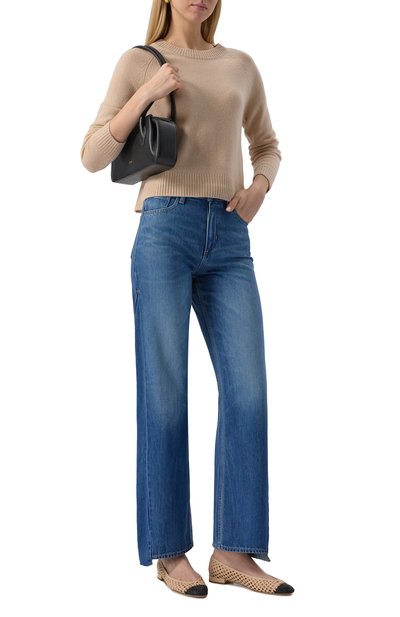 Немного расклешенные джинсы с пятью карманами выполнили из неэластичного денима. Выбеленную модель декорировали сзади кожаным патчем с тисненым логотипом марки.