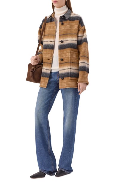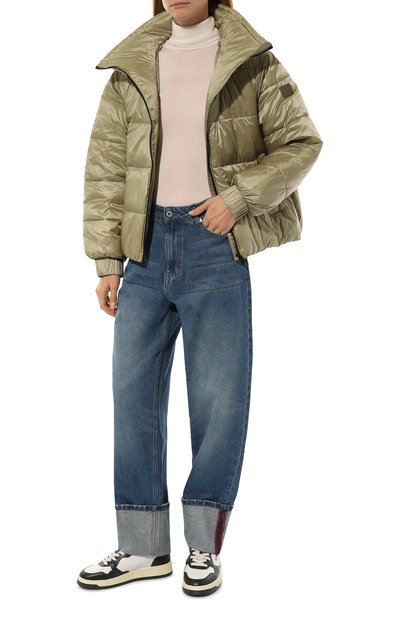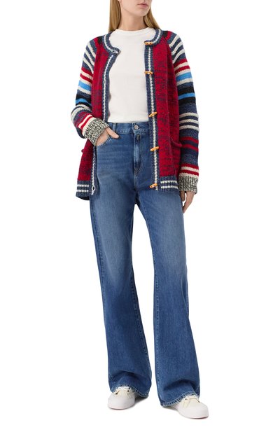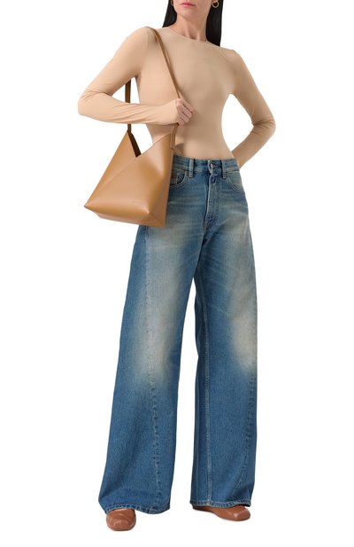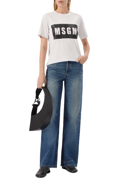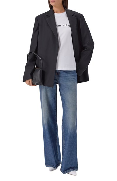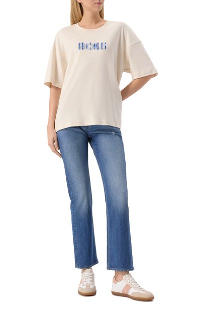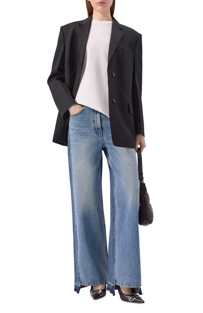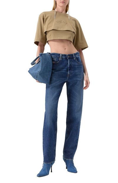 Джинсы прямого кроя выполнили из неэластичного денима. Модель с пятью карманами декорировали искусственными потертостями и кожаным патчем с тисненым логотипом марки.
