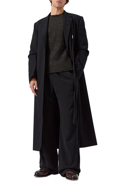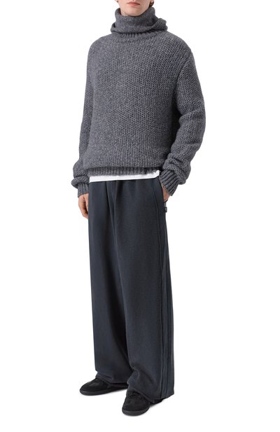 Свитер с круглой горловиной связали узором в рубчик из пряжи на основе шерсти с добавлением акрила. Спереди модель декорировали золотистой металлической литерой M.