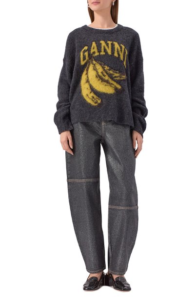 Выбеленные джинсы украсили рельефным логотипом марки на одном из пяти карманов. Для изготовления модели с высокой посадкой использовали жесткий деним.
