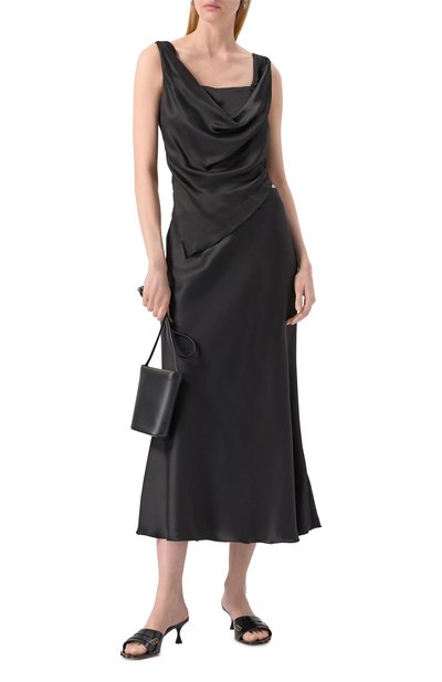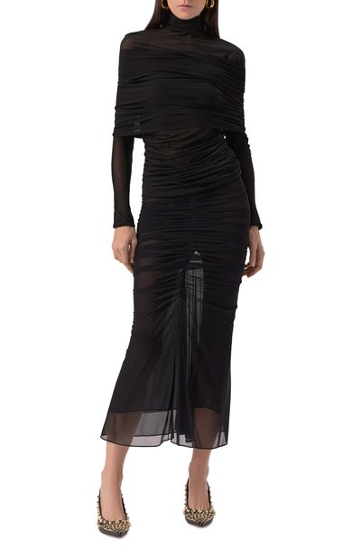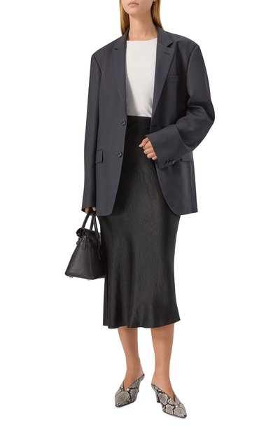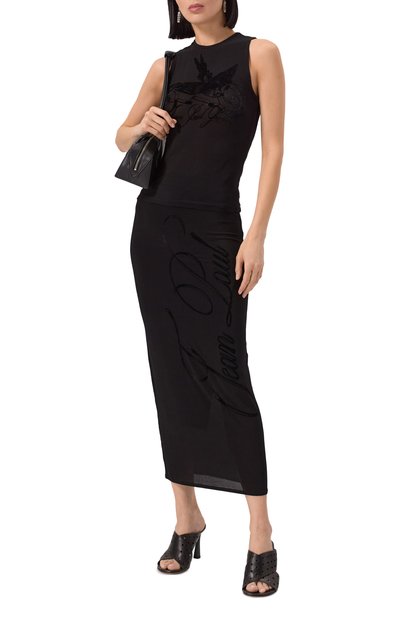 Асимметричную миди-юбку с широкой кружевной оборкой сшили из комбинации струящейся вискозы и шелка. Модель с эластичным поясом дополнили регулируемым ремешком сзади и атласным бантом спереди.