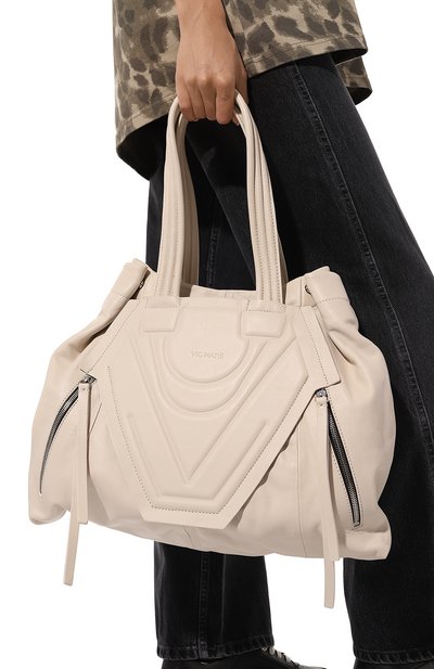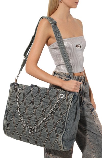 Стеганую сумку Charm-D на брендированном подкладе выполнили из состаренного денима. Внутри модели предусмотрели карман на молнии. Аксессуар со съемным ремнем и двумя ручками украсили цепочкой с кристальными подвесками в виде логотипа.