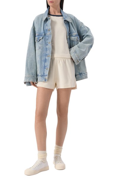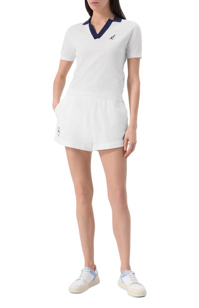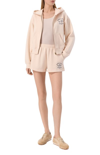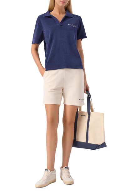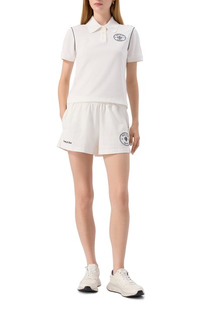Шорты с эластичным поясом и тремя карманами выполнили из хлопкового трикотажа. Спереди модель украсили контрастной брендированной надписью.