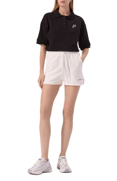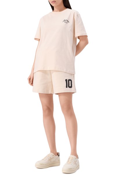 Шорты с эластичным поясом и тремя карманами выполнили из хлопкового трикотажа. Спереди модель украсили контрастной брендированной надписью.