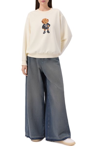 Свитшот выполнили из хлопкового трикотажа. Спереди модель с рифлеными манжетами, поясом и горловиной украсили контрастной вышивкой Wellness Club.