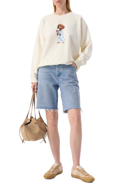 Свитшот выполнили и з хлопкового трикотажа. Спереди модель с рифлеными манжетами, поясом и горловиной украсили контрастной вышивкой Wellness Club.