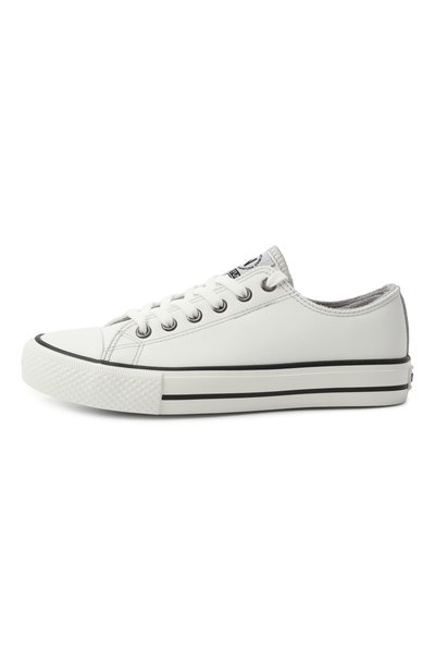 Кеды с перфорацией на мысе и текстильной вставкой на заднике сшили из матового материала, напоминающего кожу. Модель со шнуровкой и молнией украсили сбоку тисненой эмблемой марки.