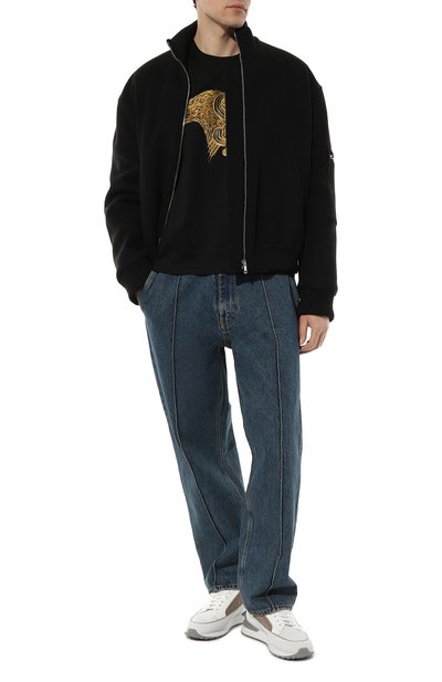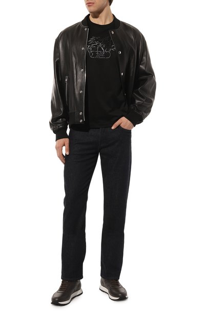 Футболку из шерстяного джерси с добавлением полиамида украсили крупной вышитой монограммой SR в тон. Фирменный декор поддержали небольшим логотипом марки на спинке.