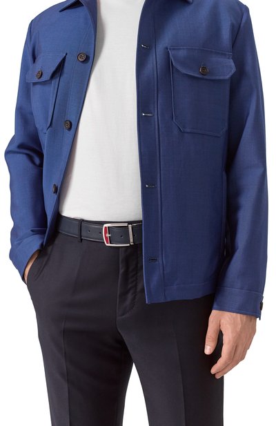 Ремень с двумя тренчиками выполнили из зернистой кожи. Аксессуар регулируется металлической пряжкой с фацетным многослойным кантом и перфорированным узором.