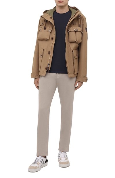 Футболку с необработанными краями выполнили из хлопкового джерси оттенка Night Blue. Модель с фирменным центральным швом на спинке дополнили брендированной нашивк ой на рукаве.
