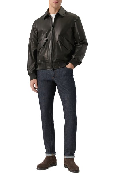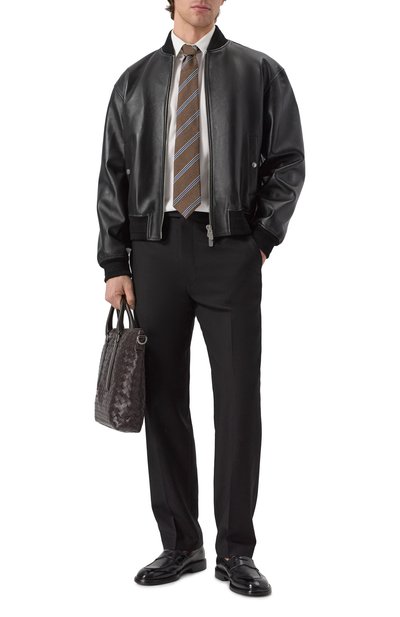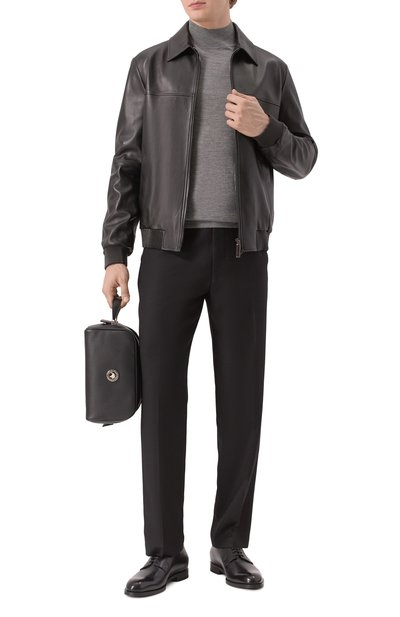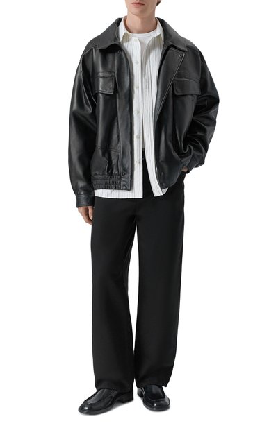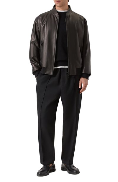 Бомбер с геометричной кокеткой выполнили из кожи ягненка, а для подклада выбрали шелковистую вискозу в тон. По бокам предусмотрели врезные карманы с широкими листочками. Куртка с трикотажными манжетами и поясом застегивается наглухо контрастной молнией.