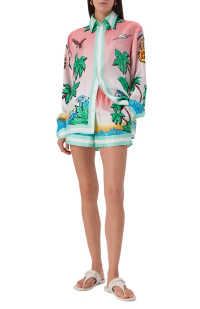 Шорты с фирменным принтом Majolica впишутся в total look с парным платьем и сумкой с таким же декором. Для пошива модели с эластичным поясом-кулиской и боковыми карманами использовали шелковый твил.