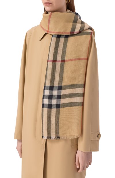Шарф с клеткой Burberry Check разных оттенков выполнили из кашемира double face. Чтобы аксессуар получился мягким, материал промыли в ключевой воде и вычесали. Концы украсили длинной бахромой и логотипом марки.