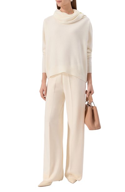 Oversize-свитер с рифлеными манжетами, низом и высоким воротом выполнили из шерстяной пряжи с добавлением кашемира. Модель со спущенной линией плеч органично поддержит образ и в светлой, и в темной палитре.