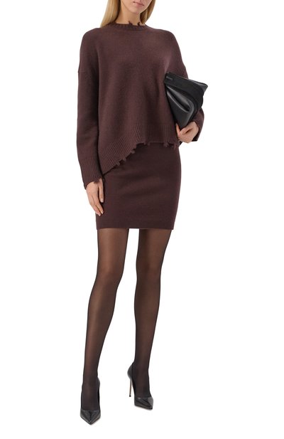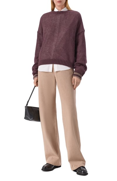 Свитер свободного кроя станет основой комфортного повседневного образа с джинсами. Для изготовления модели с рукавами реглан и круглой горловиной использовали пушистую пряжу из чистой шерсти.
