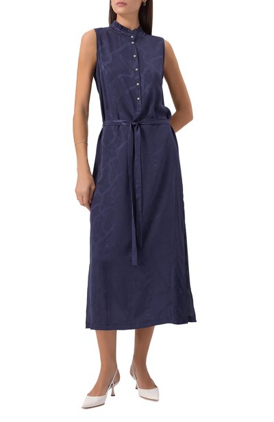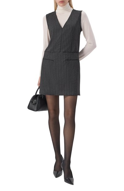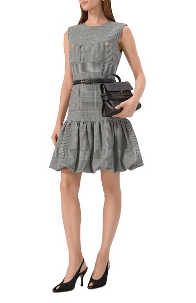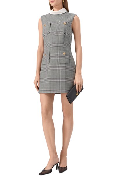 Приталенное мини-платье в клетку «принц Уэльский» выполнили из эластичной ткани на основе полиэстера и вискозы. Модель с потайной молнией на спинке и атласным однотонным воротником-стойкой дополнили четырьмя накладными карманами с золотистыми пуговицами.