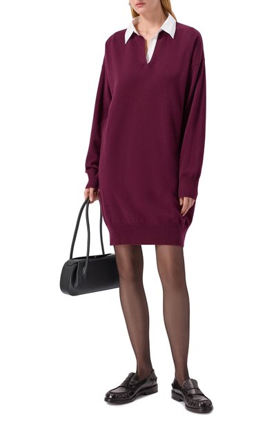 Приталенное миди-платье с потайной молнией и пуго вицами сзади выполнили из полиэстерового атласа. Модель с крупными кристаллами на плечах декорировали драпировками на лифе спереди и на запахе подола с высоким разрезом.