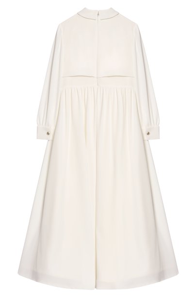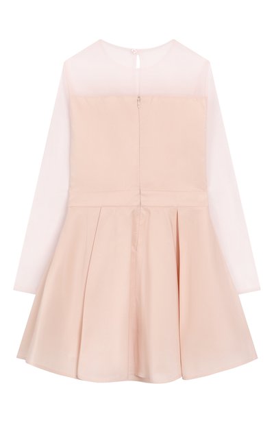 Платье с круглой горловиной и манжетами в рубчик выполнили из хлопкового футера. Такой же трикотаж выбрали для оборки на подоле модели и вставки, напоминающей фирменную сумку.