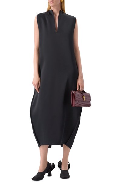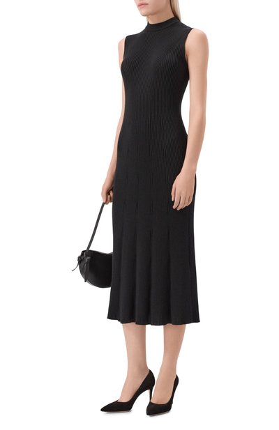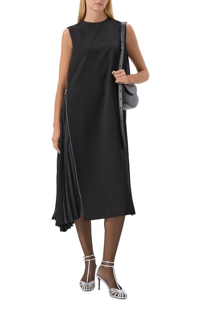 Платье с каймой в тон на горловине и проймах выполнили из шерсти. Модель с двумя боковыми карманами застегивается акцентной молнией сзади, дополненной длинным пуллером.