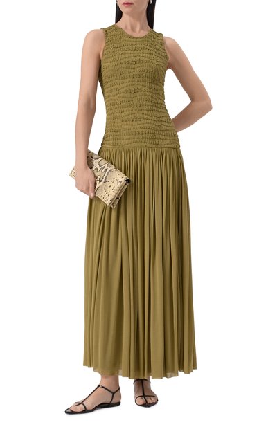 Макси-платье со вставкой на подоле, создающей иллюзию многослойности, выполнили из вискозы с добавлением нейлона. Модель с цельнокроеным высоким воротом завязывается лентами и застегивается пуговицей на каплевидном вырезе сзади.