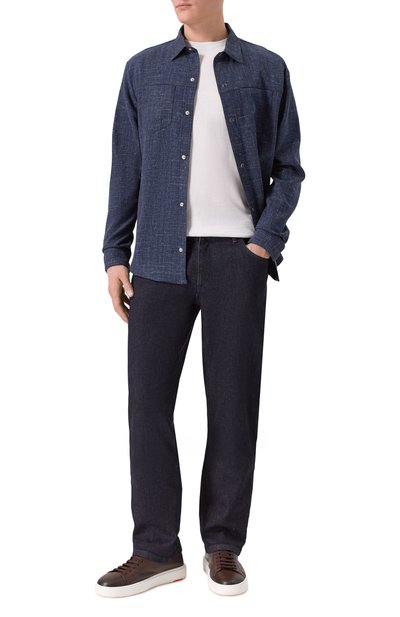 Рубаш ку с прямоугольными манжетами выполнили из шерстяного канваса оттенка Volcanic glass. Отложной воротник модели украсили тремя рядами люверсов, которым вторят металлические кнопки.