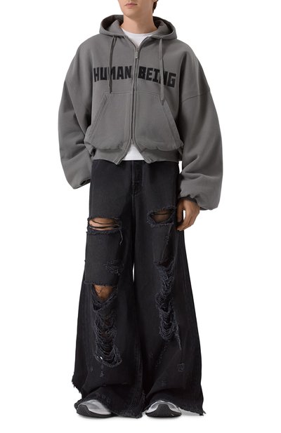 Толстовку Trompe L'oeil с декоративными потертостями на краях боковых карманов, ребристых манжетах и поясе сшили из меланжевого хлопкового денима. Модель с капюшоном и встречной молнией украсили вышитой эмблемой Sports Icon.