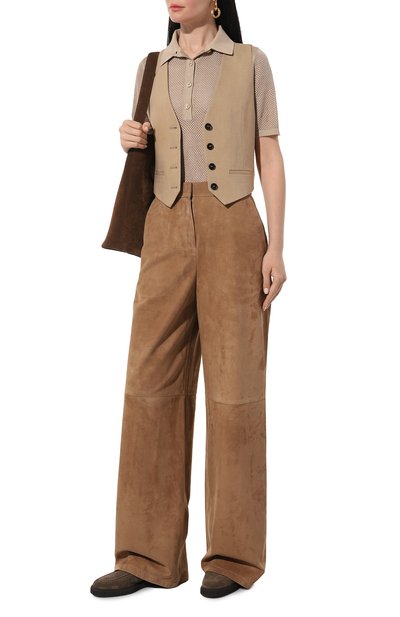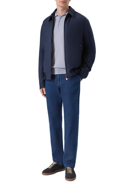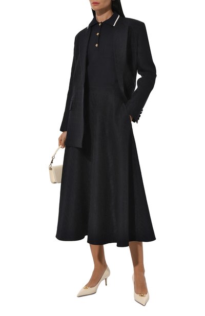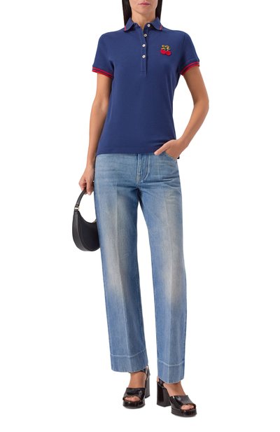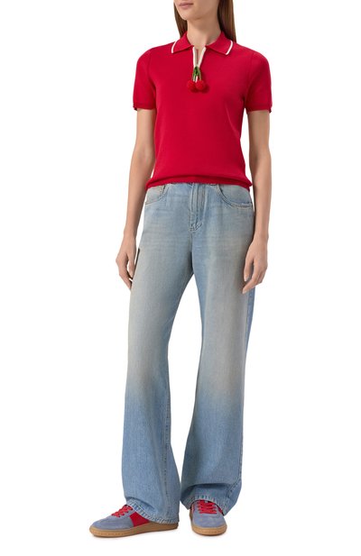 Поло с манжетами и поясом в рубчик сшили из хлопкового трикотажа. Модель с контрастной полосой по краю отложного воротника застегивается короткой молнией с вязаными ягодами вишни на пуллере.