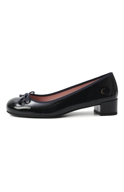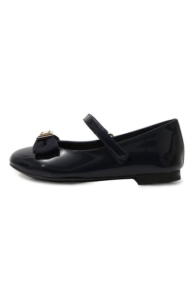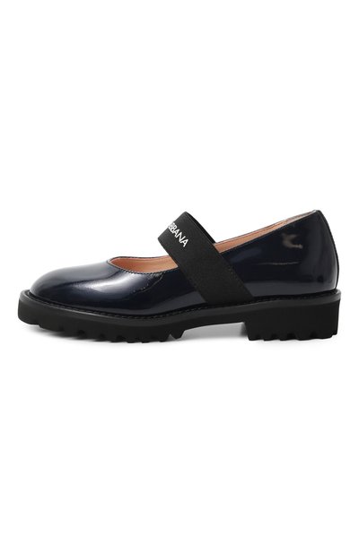 Туфли на широкой подошве с протектором изготовили из телячьей кожи с лакированным покрытием. Эластичный ремешок на подъеме украсили контрастным логотипом.