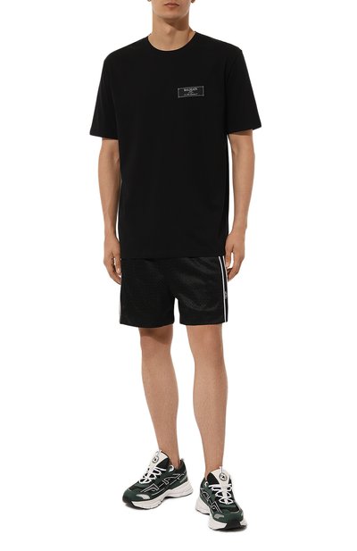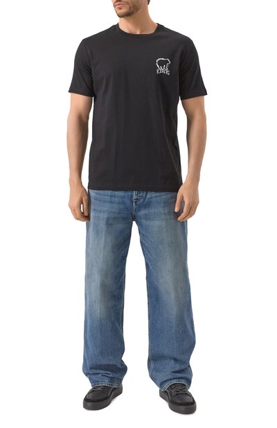 Футболку с круглой горловиной в рубчик украсили контрастным брендированным принтом. Для изготовления модели использовали хлопковое джерси.