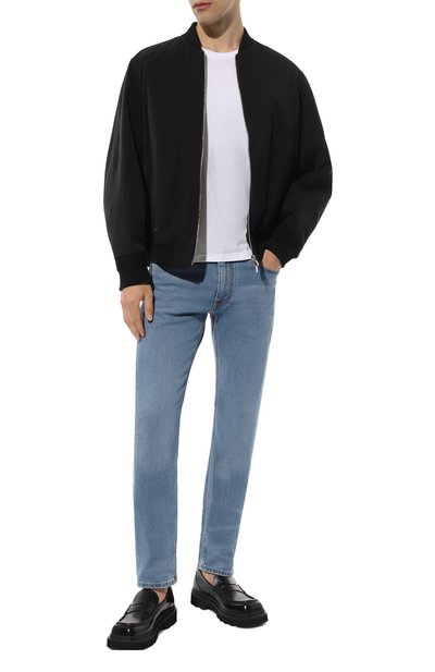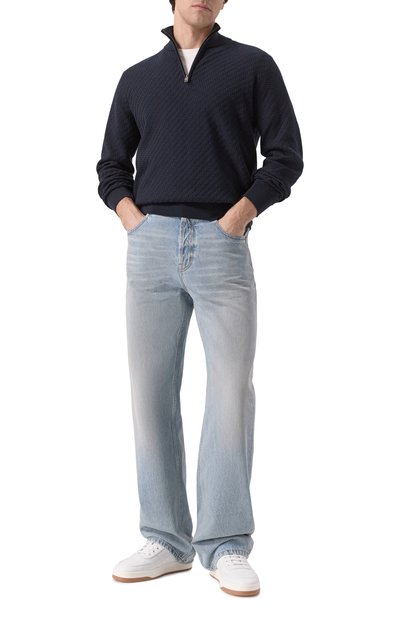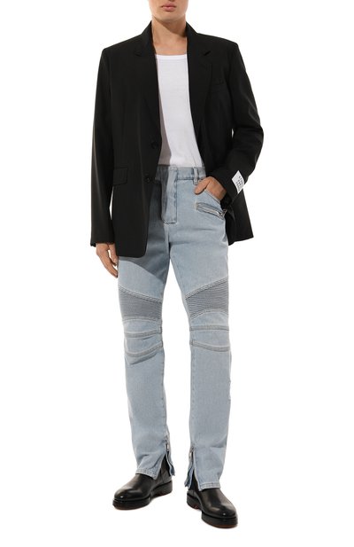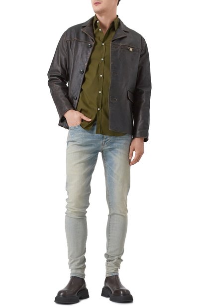 Зауженные джинсы со средней посадкой сшили из хлопкового денима. Модели придали состаренный вид с помощью декоративных пятен, напоминающих загрязнения, разрывов и заломов. Изделие дополнили пятью карманами и брендированным патчем.