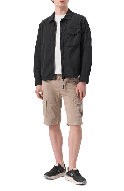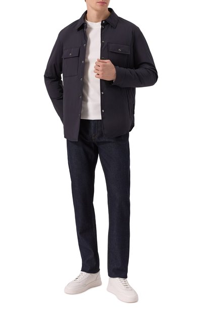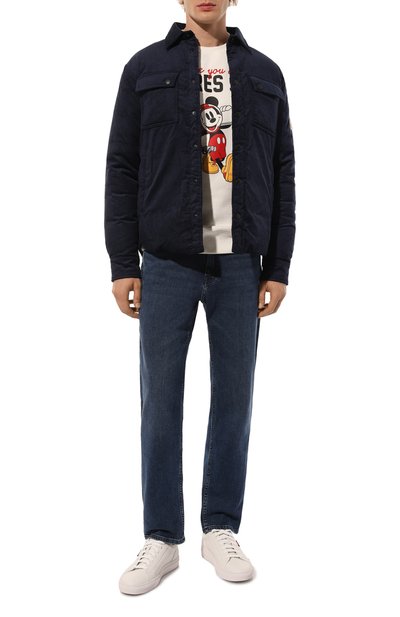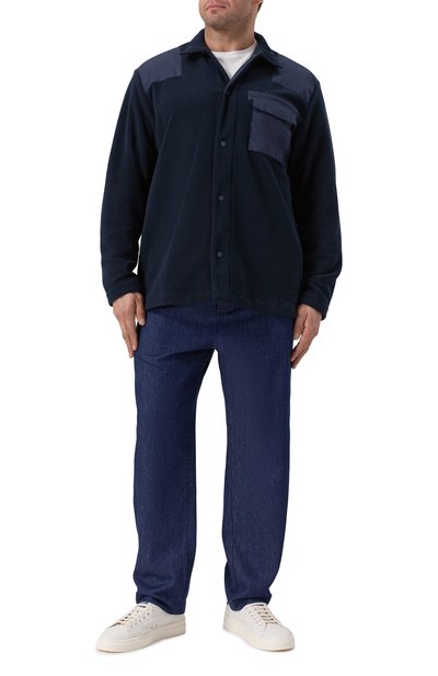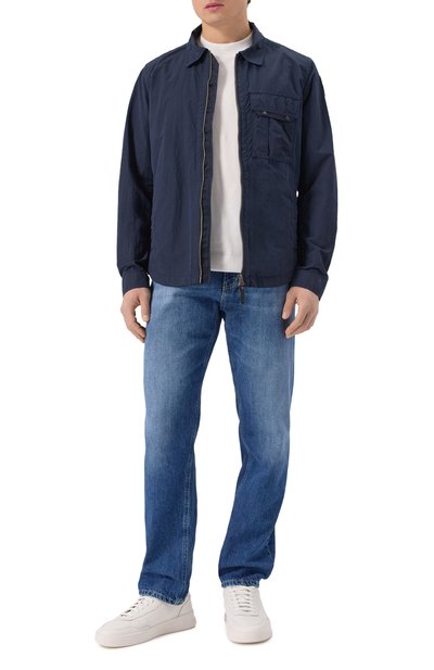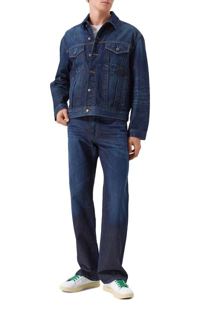 Джинсовую куртку с прямоугольными манжетами и регулируемыми патами на поясе по бокам дополнили нагрудными карманами с клапанами. Сзади свободную модель из жесткого денима украсили брендированной нашивкой.