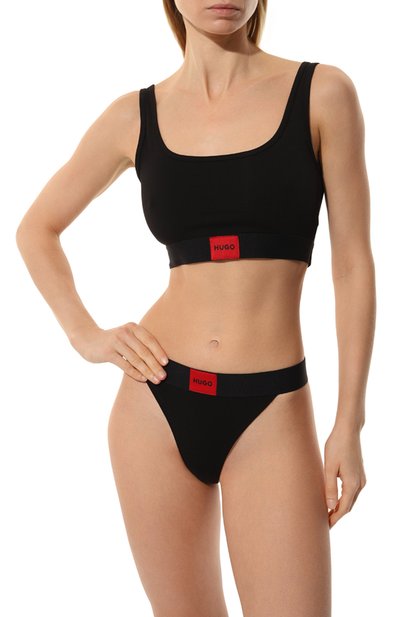 Бра-топ с регулируемыми бретелями и съемными вкладками выполнили из стрейчевого трикотажа на основе модала с добавлением переработанного полиамида. Спереди модель с V-образным вырезом декорировали квадратным патчем с логотипом.