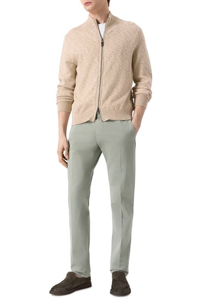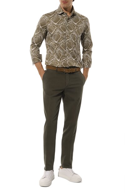 Брюки-карго с тремя парами карманов выполнили из хлопка с добавлением полиэстера и эластана. Сзади модель с защипами украсили эмблемой Double B в тон.
