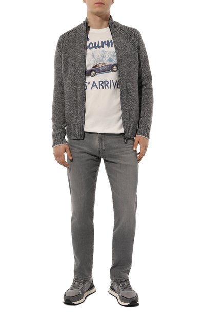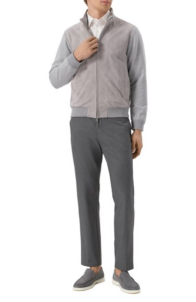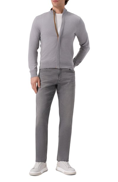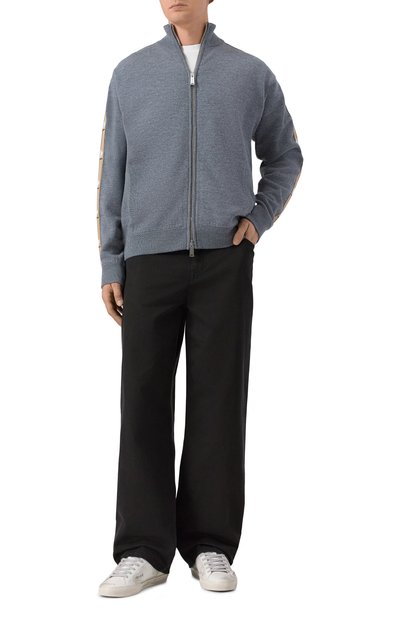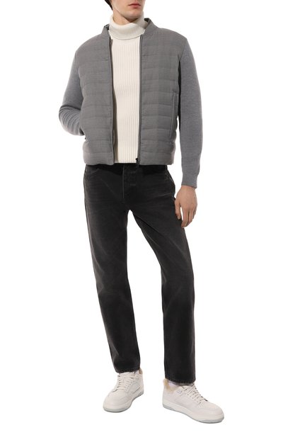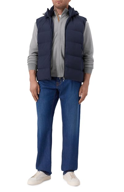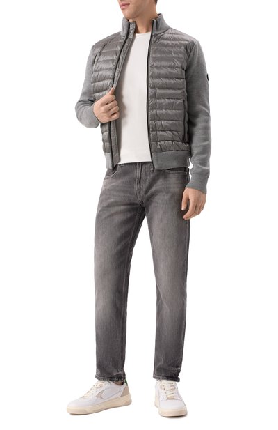 Кардиган с боковыми карманами связали английской резинкой из шерстяной пряжи с добавлением кашемира. Регулируемый капюшон, как и стеганые полочки, утепленные гусиным пухом, выполнили из фланели. Модель застегивается встречной молнией.