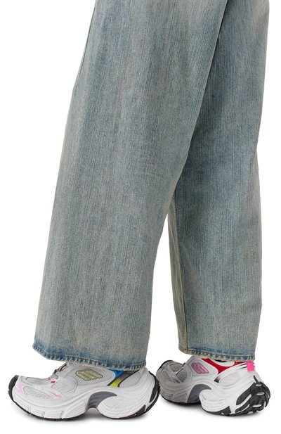 Для создания кроссовок Triple S выбрали экокожу с декоративными потертостями, а для внутренней отделки – сетчатый трикотаж. Пару с контрастным граффити в виде логотипа установили на широкую подошву. Задник и язычок с названием модели дополнили текстильными петлями.