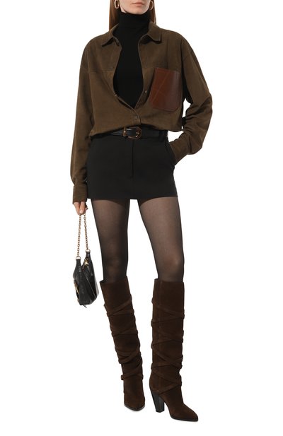 Сапоги Hansen с зауженным мысом и высоким тонким каблуком сшили из мягкой телячьей кожи. Модель с широким голенищем не нуждается в застежке.