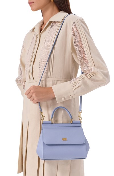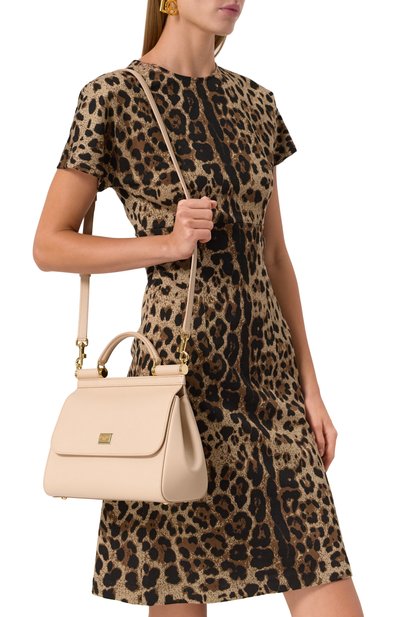 Сумку Sicily с фирменной двухслойной пластиной выполнили из телячьей кожи Dauphine. На дне предусмотрели металлические пукли, а внутри разместили карман на молнии и карточный слот. Аксессуар с леопардовым принтом на хлопковом подкладе застегивается кнопочным замком. В комплекте – съемный регулируемый ремень.