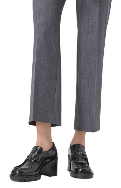 Кожаные туфли с внутренней отделкой из овчины установили на массивную резиновую подошву с устойчивым каблуком. Перемычку модели с фактурным швом, обрамляющим мыс, украсили пряжкой.