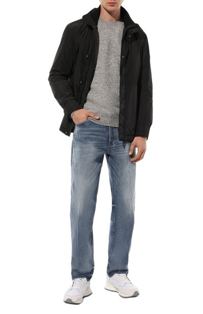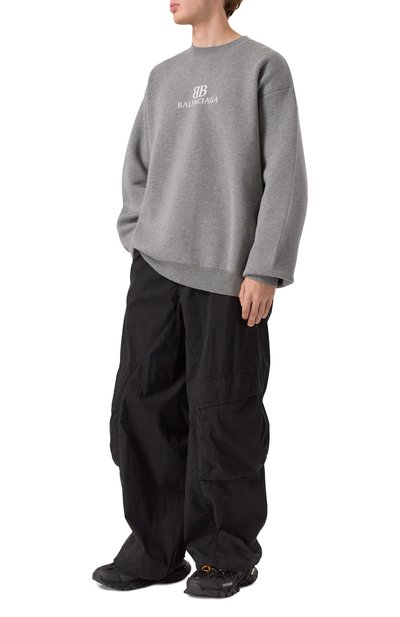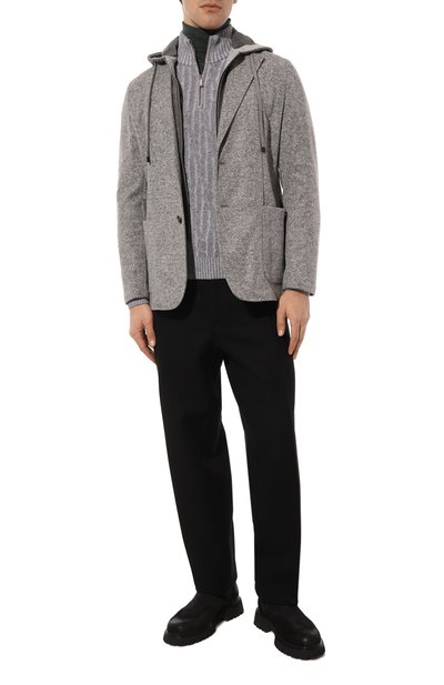 Свитер с арановым узором связали из меланжевой пряжи на основе шерсти альпака и полиамида. О принадлежности модели бренду напомнили фирменной пластиной над эластичным поясом.