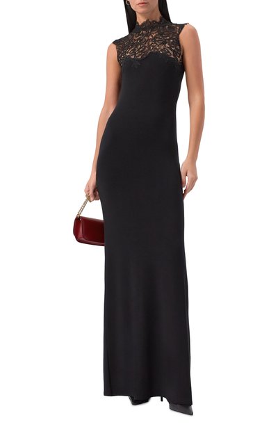 Атласное макси-платье с драпировками спереди и сзади сшито из струящегося микса аце тата и вискозы. Приталенная модель без декора дополнена высоким боковым разрезом.