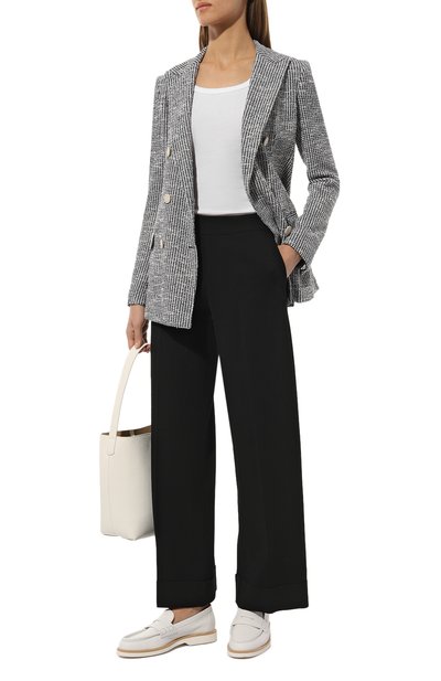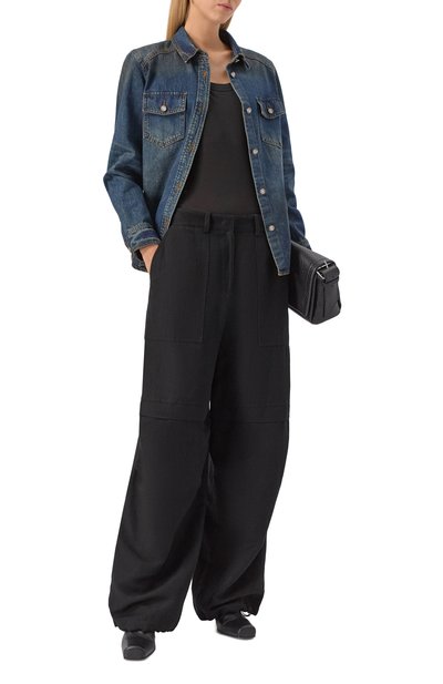 Для пошива широких брюк с немного смещенными швами использовали твил из органического хлопка. Модель дополнили прорезными боковыми карманами и накладными задними.