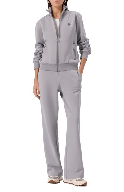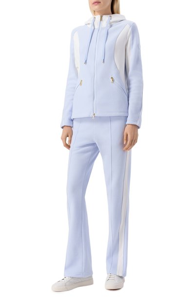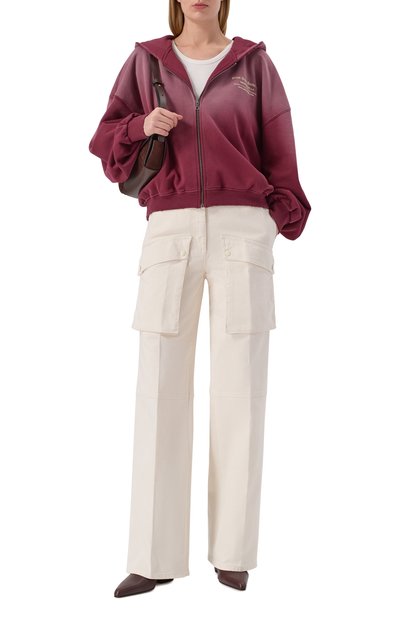 Укороченную толстовку с широким поясом и манжетами в рубчик выполнили из хлопкового трикотажа. Слегка выбеленную модель с капюшоном декорировали спереди лентой с логотипом марки.