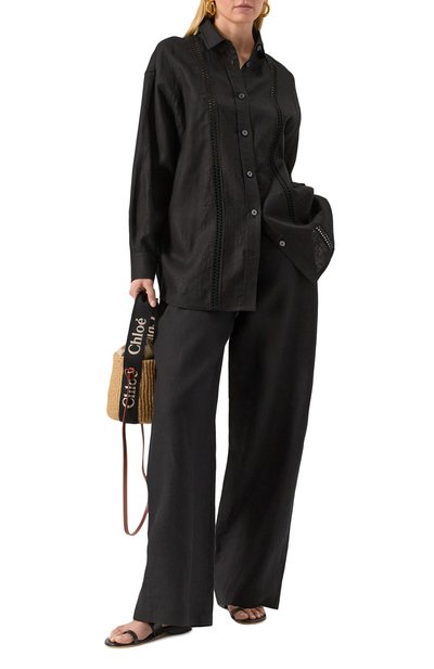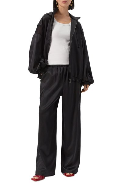 Брюки свободного кроя выполнили из хлопкового трикотажа, искусственно состаренного стиркой с кислотой. Пояс-кулиску модели с боковыми карманами на молниях продублировали брендированной эластичной вставкой, напоминающей резинку трусов.