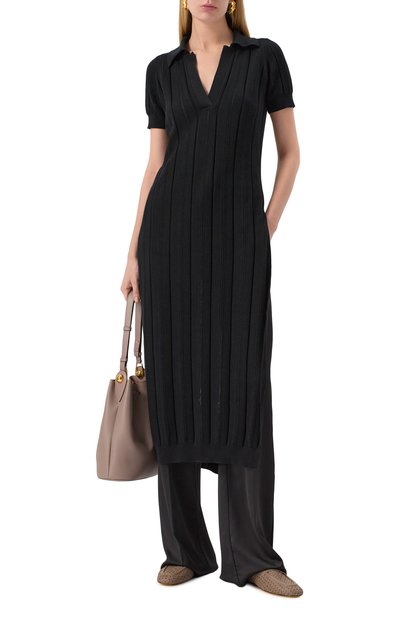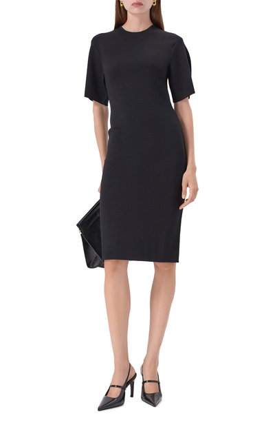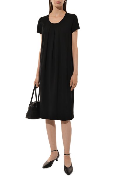 Приталенное миди-платье с драпировками на лифе сшили из струящегося микса вискозы, льна и хлопка. Модель с круглой горловиной застегивается потайной молнией сзади.