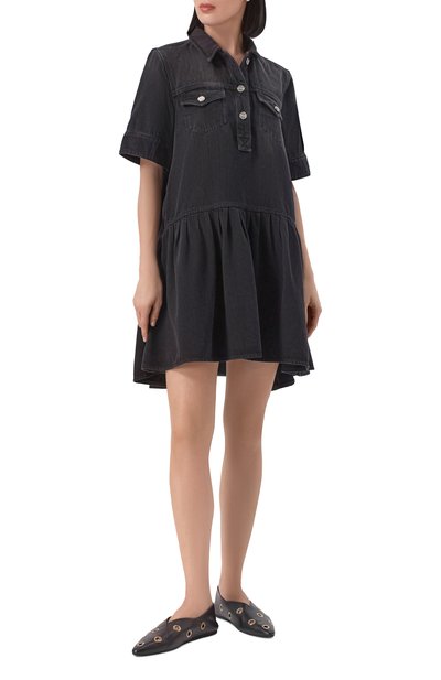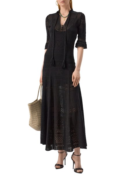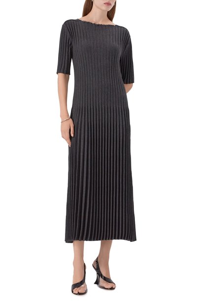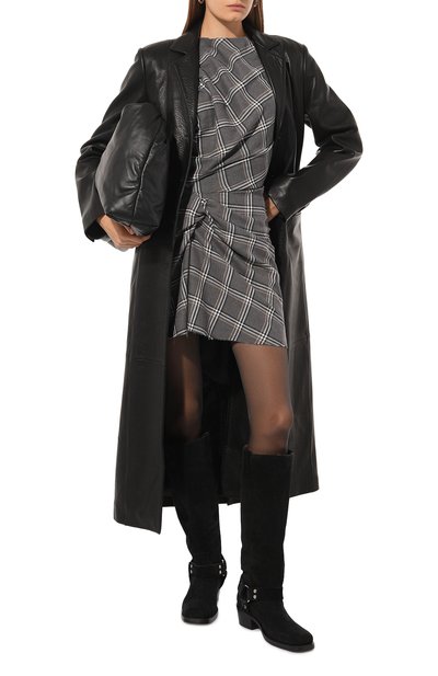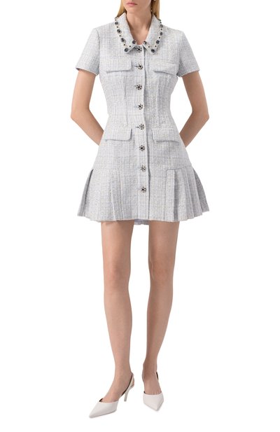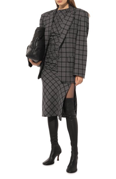Клетчатое миди-платье напоминает комплект из жакета и юбки. Лиф с четырьмя накладными карманами сшит из шерсти, а плиссированный подол – из шифона. Модель, застегивающаяся пуговицами спереди и потайной молнией сбоку, дополнена поясом с пряжкой.