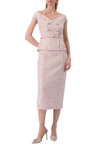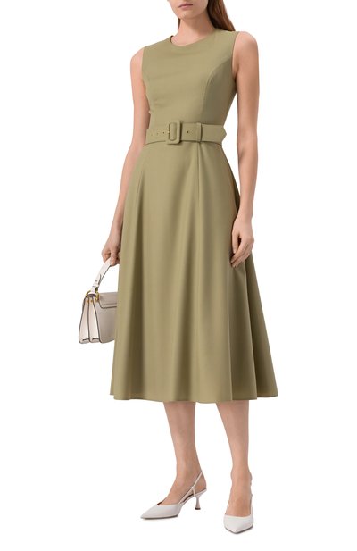 Платье, напоминающее комплект из топа и миди-юбки, дополнено съемным поясом с пряжкой. Лиф с четырьмя накладными карманами и декоративными пуговицами сшит из тафты. Модель с плиссированным подолом из шифона застегивается потайной молнией сзади.