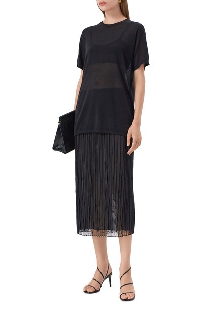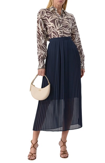 Миди-юбку со складками, акцентированными кантом, выполнили из тонкого трикотажа на основе шелка и хлопка. За удобную посадку на талии отвечает широкий эластичный пояс в рубчик.