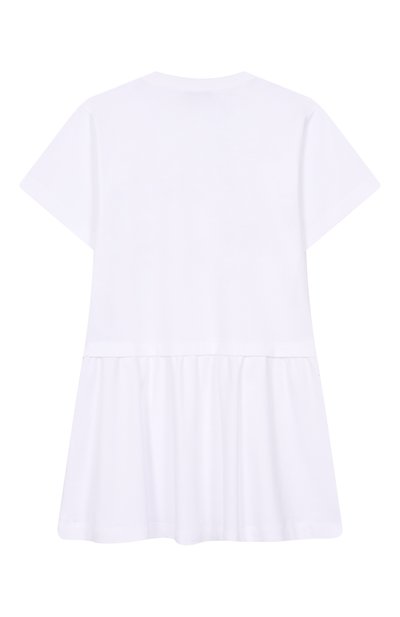 Платье с круглой горловиной и манжетами в рубчик выполнили из хлопкового трикотажа. Модель украсили изображением фирменного медвежонка, полосатый бант на шее которого расшили прозрачными пайетками.