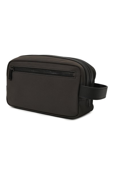 Несессер с плоской боковой ручкой сшит из влагоотталкивающего материала, напоминающего сафьяновую кожу. Аксессуар на молнии украшен небольшой эмблемой бренда спереди.